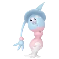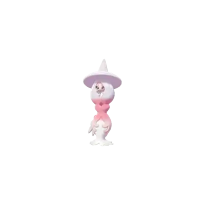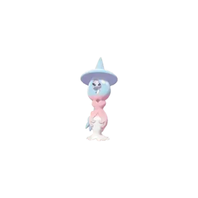 Hatterene is a small humanoid Pokémon with a thin, white body. Its head is round, has a small mouth, narrow black eyes with white pupils, and two elliptical pink markings over each of its eyes resembling eyelashes or eyebrows. It has extremely long, layered, symmetrical hair, far longer than its body is tall; much like a cloak, the hair on its head drapes to the ground and swathes around it to conceal much of its true body, which is adorned by a pink semi-translucent dress that gives it a much taller silhouette, resembling that of a stereotypical sorceress or witch. This hair is colored in a gradient of baby-blue, pale pink, and white from its upper portions downwards. The hair above Hatterene's head is shaped like a wide-brimmed witch's hat with a conical shape serving as the crown of the hat formation. Extending from the pointed end of the hat is a single tentacle that ends in a pink bulb and a consecutive baby-blue bulb that has a trio of sharp claws, which can articulate in a manner similar to fingers, jutting out of it. Hatterene is a female-only species.