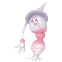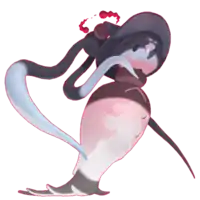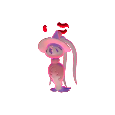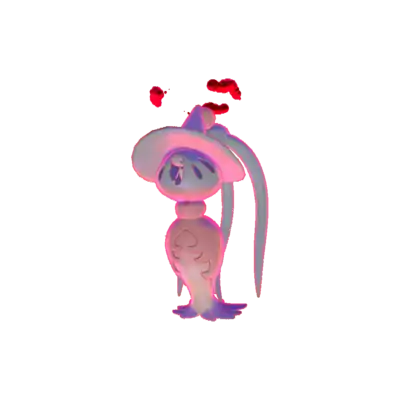 Thanks to powerful Dynamax energy that allowed it to assume a Gigantamax form, Gigantamax Hatterene has grown to a colossal size. While its physiology remains vastly the same, its black eyes are now blue with white pupils. In addition to this, its hair has grown and increased in volume, forming a chamber of sorts that its body sits in. On both sides of this chamber are a pair of teardrop-shaped openings. The hat-like formation on its head has also changed, with the brim being thinner and draping around it and the crown ending in a pink bulb. Attached to the said bulb is a larger baby-blue bulb that has three, long tentacles tapering from it. As seen with all Dynamax and Gigantamax Pokémon, three red clouds loom and swirl above the hat of Gigantamax Hatterene.