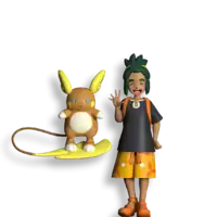 Hau's design is based on his appearance in Pokémon Sun, Moon, Ultra Sun, and Ultra Moon. Alolan Raichu is one of Hau's main Pokémon in the core series games. Alolan Raichu's Dex entry comes from Pokémon Ultra Sun.