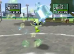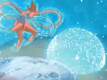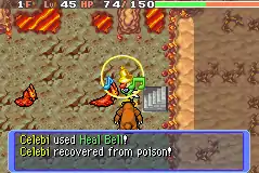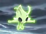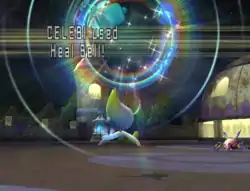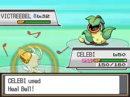Celebi closes its eyes and waves of blue-green energy come off its body. The waves make a bell-like sound, and heal everything around it, or Celebi's body glows white and it releases a blue ring off its body, healing itself. | ||
