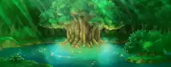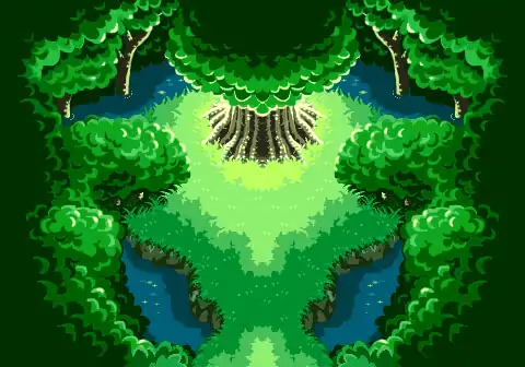 Healing Forest is an average-looking forest clearing. Sunlight streams into the area from above and gives it a peaceful, yet secluded, feel, and one lone particularly large tree stands in the middle of the clearing.