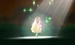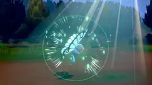 Jirachi flies into the sky, and its body starts to glow white. It then lets out a burst of light-blue, sparkling lights that rain down onto Jirachi's allies, healing them. After using the move, Jirachi faints. | ||