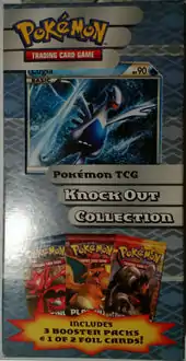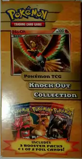 The HeartGold & SoulSilver Knock Out Collection was a repackaging promotional box released sometime near the end of the HeartGold & Soulsilver Series exclusively at Rite Aid pharmacies. These boxes contained a promotional card, as well as three booster packs. The promotional cards were Ho-Oh or Lugia HGSS Promotional card previously available in the HeartGold & SoulSilver Poster Packs. The three booster packs were initially from Undaunted, Supreme Victors, and Rising Rivals, but later issues of this product contained different packs ranging from Mysterious Treasures to Call of Legends.