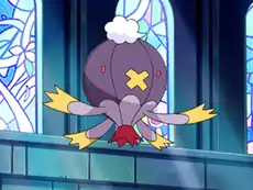 Drifblim is Fantina's main Pokémon, having raised it since it was an Egg. It first appeared as a Drifloon in Playing The Leveling Field! where it was used in a practice battle against Ash and completely overwhelmed his team with Hypnosis before evolving into Drifblim. After training, Ash returned for an official Gym battle where Drifblim proved to be more powerful than before, managing to put to sleep and knock out Pikachu and Buizel before being defeated by Chimchar. | ||