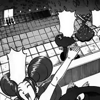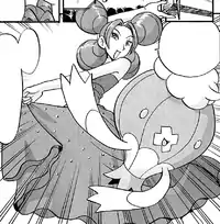 Thanks to the illusions, Mismagius was easily able to defeat Platinum's Empoleon and Ponyta, leaving her with just Lax. Against the gluttonous Pokémon, Fantina had Mismagius create an illusion of masses of food to distract it while the Magical Pokémon kept attacking it. Platinum was too confused by the illusions to fight back, making her chances of winning look slim. However, Pearl then noticed that Diamond, being a glutton like Lax, had no trouble with the food illusion, causing him to realize that Mismagius's illusions affect each people and Pokémon differently. Due to Pearl and Platinum's strong sense of reality, the illusions were causing them to have a headache, while Diamond and Lax had no trouble accepting the illusion and enjoying it. Upon realizing this, Pearl conveyed his findings to Platinum, who started playing along with Lax, much to Fantina's irritation. Just as Fantina was about to have Mismagius finish Lax off, the Big Eater Pokémon flung the Iron Ball it had been holding at Mismagius, defeating it and winning the battle for Platinum.