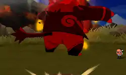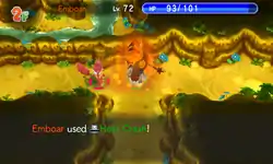 | Emboar jumps high into the air and surrounds its body in a sphere of yellow-orange flames. Emboar then falls on top of the opponent, crushing them. | |||