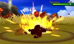 | Pignite's body burst into flames. It then jumps into the air and crushes the opponent with its weight. | |||