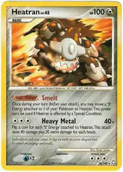 Heavy Metal is an Ability later introduced in the Generation V Pokémon games that Heatran cannot have. The Japanese name of Heavy Metal is spelled ヘビーメタル rather than ヘヴィメタル as in the video games. This card's Pokédex entry comes from Pokémon Diamond and Pearl.