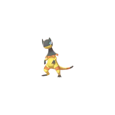 Heliolisk is a bipedal Pokémon that resembles a yellow lizard. Its head is mostly black with a yellow lower jaw. It has blue eyes with a pointed spike over each. Covering its neck is a black frill with orange spikes around the rim. This frill can be raised to frame its head if needed. Its hands and feet are black with three digits each and there is an orange band with triangular markings around each leg. It has a long, tapering tail that is orange and then black at the tip.