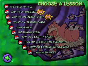 The Learn menu (also referred to as the Lesson menu in the game dialogue) in Pokémon Play It!, as well as the Help menu in Pokémon Play It! Version 2, contain information about the Pokémon Trading Card Game.