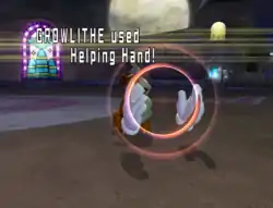 Helping Hand (Japanese: てだすけ Help) is a non-damaging Normal-type move introduced in Generation III. It was TM03 in Pokémon: Let's Go, Pikachu! and Let's Go, Eevee!, and is TM41 in Generation VIII.