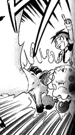 | Makuhita releases a bolt of blue electricity from its body at the target, powering it up. | |||