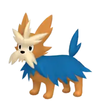 Herdier is a light brown, canine Pokémon with a short snout. Its face has long, cream fur, which forms a mustache and a three-pointed crest. Its ears are large and perked, and it has a black nose. It has shaggy dark blue fur covering its body and a short tail. This hard, thick fur serves to protect Herdier from attacks. It has four short legs, with three-toed paws. Each paw has a dark blue paw pad that can be seen in Pokédex 3D Pro.