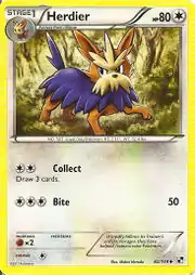 Herdier (Japanese: ハーデリア Herderrie) is a Colorless-type Stage 1 Pokémon card. It was first released as part of the Black & White expansion.