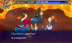 Hex appears as one of Chandelure's Pokémon moves. Chandelure grabs from a distance and barrages the opponent, reducing their recoverable HP. If used while the opponent's stats are lowered, the attack's damage increases.