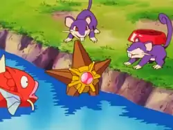 In The Electric Tale of Pikachu, the Hidden Village appears in Pikachu's Excellent Adventure. When Ash and Brock meet A.J. and Samurai after a performance by Duplica and her Ditto, they make plans to visit the Hidden Village, a paradise for lost Pokémon which have been abandoned by their Trainers and is supposedly run by a goddess. Deciding to seek out the Hidden Village in search of high-leveled Pokémon, A.J., Samurai, Ash and Brock head for a bus, however, Pikachu is distracted by a Squirtle shell and is separated from Ash. Remembering that Ash wanted to find the Hidden Village, Pikachu tags along with an abandoned Squirtle, Damian's Charmander, a wild boy named Tommy and his Kangaskhan mother to find the Hidden Village and hopefully reunite with Ash. Jessie and James tag along, hoping to steal rare Pokémon, but they are stopped by Kangaskhan.