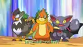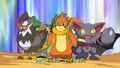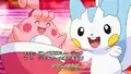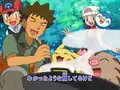 After a close-up of Brock, he is now seen cooking with Pikachu and Mamoswine nearby and then Pikachu and Piplup are seen playing while the other Pokémon, Ash, Dawn, and Brock are seen cheering them on. Dawn, with Piplup and Ambipom, are then seen glaring at Zoey and her Glameow and Kenny and his Prinplup while Ash, with Pikachu and Monferno, glare at Paul with his Honchkrow.