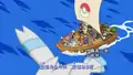 This scene features a camera effect that zooms out from Dawn's eye, moves to an upper view while rotating in 360° around the boat, then ends with a zoom in to Brock's eye. The following images are taken from one of the few frames in which all the characters are visible at the same time. Click on each picture for a larger view.