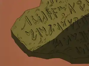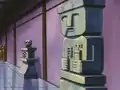 When Dr. Eve was exploring the ruins of Pokémopolis during The Ancient Puzzle of Pokémopolis, she discovered a number of old artifacts. A handful of these relics contained ancient, giant Pokémon, and so can be seen as forerunners to the contemporary Poké Ball. These objects were named by a stone tablet that had inscribed on it the legend of Pokémopolis. The "Unearthly Urn" and accompanying spoon contained a giant Alakazam, which, to activate, one had to insert the spoon into the Urn. It appeared that the Alakazam could do this autonomously from within the Urn using its psychic powers. The "Dark Device" contained a giant Gengar. It is unknown what initiated its release. Finally, the giant paintbrush/bell that was discovered contained a giant Jigglypuff, and was activated by the song of a regular-sized Jigglypuff.