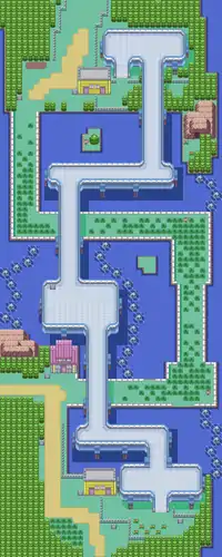 The entrance cave to New Mauville is located inconspicuously just off land in the northeastern area of the sea. It can be accessed by surfing from the Mauville side of the route, and underneath the cycling road. Also in the sea is a patch of land with a tree that has vines that may be cut down to create a Secret Base.