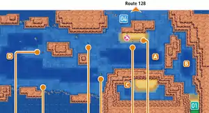 In Pokémon Omega Ruby and Alpha Sapphire, this route contains a large underwater section that continues into Route 130. By going underwater and heading east players can access the Secret Shore, where they can build Secret Bases. There are several new Trainers and hidden items underwater.