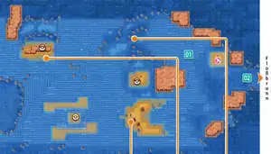 At the start of the current, the route separates into three paths. The lowest path leads to a large island that plays home to a Trainer. This path is also the route that Trainers destined for the Sealed Chamber on Route 134 must follow. The center pathway leads to a small, rock-filled island home to a Trainer and a Rare Candy. The northern-most route passes two Trainers before merging with the center path as it becomes Route 133.
