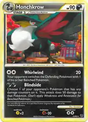 Whirlwind is a move in the Pokémon games that Honchkrow can learn via breeding. Blindside is an attack first seen on Skyridge Murkrow. This card's Pokédex entry comes from Pokémon HeartGold and SoulSilver.