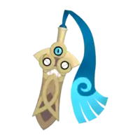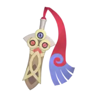 Honedge is a Pokémon that resembles a sword from medieval times. Its body is a silver sword with a light gray hilt. Embedded in the hilt is a blue gem with a dark center that appears to be its eye. The blue eye is said to be the true form of Honedge. Attached to the pommel is a long, dark blue cloth with a swirl design in lighter blue at the tip; the tip of the sash splits into four tassels. The sash is known to suck the life energy out of anyone who dares to grab it by the hilt. Honedge's sheath is dark brown with curved lines resembling a triquetra across its surface. Near the top of the sheath are two rings and a hole that in conjunction with the shape of Honedge's blade create the illusion of a face, with eyes and a mouth. A third ring extends onto the hilt and encircles its actual eye. Honedge is said to have been born from a person's soul after they were killed by the sword that it resides in.