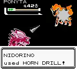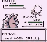 Rhydon's horn spins like a drill and its body becomes surrounded by light blue, spiraling streaks of energy. It then charges at the opponent and stabs it with its horn. If hit, the target will faint instantly. | ||