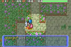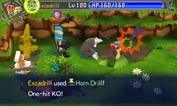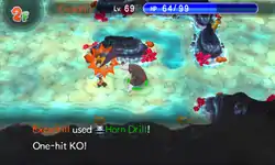 In Red Rescue Team and Blue Rescue Team, Horn Drill has 12PP and 35% accuracy. The user attacks enemy in front and makes them faint through "calamitous damage" (internally treated as 9999 damage), regardless of the level. Although most damaging moves can damage a Pokémon immune to the move in main series, Horn Drill will always fail if the target has the type immunity.