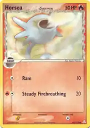 Horsea δ (Japanese: タッツー δ Tattu δ) is a Fire-type Basic Pokémon card. It is part of the EX Holon Phantoms expansion.