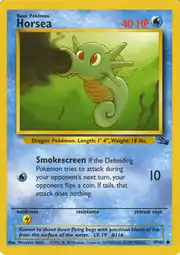 Horsea (Japanese: タッツ Tattu) is a Water-type Basic Pokémon card. It is part of the Fossil expansion.