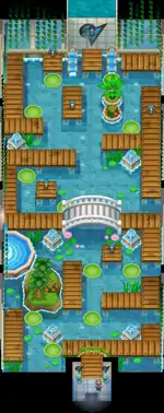 The Gym is a designed somewhat like a bog, with tall grass and lily pads in the water, also decorated with several fountains. The player must move from one wooden platform to another by floating on the lily pads, eventually reaching Marlon at the end of the Gym. After Marlon is defeated, he will hand out the Wave Badge and TM55 (Scald), after which he will jump off the platform and swim away. The player can then ride a lily pad straight back to the entrance.