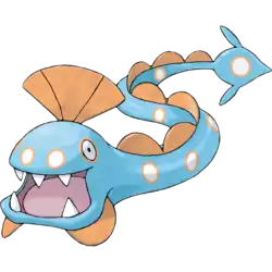 Huntail is a light-blue, aquatic Pokémon with a serpentine body. Orange, semi-circular fins run the length of its spine, and there are two additional fins on the underside of its lower jaw. A large, fan-like fin projects from the top of its head. White spots that are surrounded by orange rings, resembling its eyes, dot its body. It attracts its prey by wagging its fish-shaped tail, which features glowing eye-spots, a single dorsal fin, and a single pectoral fin. Huntail's large mouth features sharp teeth and allows it to gulp its prey whole.