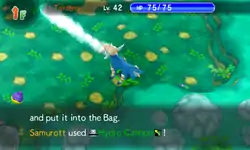 In Red Rescue Team and Blue Rescue Team, Hydro Cannon is a move with 30 base power, 9 PP and 84% accuracy. The attack travels up to 10 tiles away and hits the first Pokémon it encounters, ally or enemy. If the move hits a Pokémon successfully, the user is inflicted with Paused status condition for 1-2 turns, preventing them from acting on these turns.