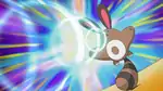Both of Minccino's ears roll up, first one then the other. It then takes in a deep breath and shouts loudly. As it shouts, the inside of its mouth glows white and a beam of wind with turquoise rings inside them come out from Minccino's mouth and hit the opponent. | ||