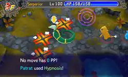 In Pokémon Super Mystery Dungeon, if the enemy is already sleeping, Hypnosis will cause the enemy to become terrified. A terrified Pokémon will run away, and cannot use moves or items. If the enemy uses Hypnosis on one of the player's sleeping Pokémon, the Pokémon will become its puppet. While in the puppet status, the Pokémon will randomly attack its allies or use items. The player cannot switch to the Pokémon affected with this status. If the leader has puppet status, the player won't be able to do anything until it wears off. The puppet status will last until the sleep status wears off.