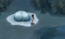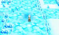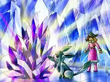 An Ice Rock appeared in a flashback in A Full Course Tag Battle!, where it was revealed that May had visited it in a cave near Snowpoint City in order to evolve her Eevee. Unlike the games, where an Eevee must be leveled up but can be anywhere in the area housing the Ice Rock, May's Eevee promptly evolved into a Glaceon upon touching the Ice Rock, much like an Evolution stone.