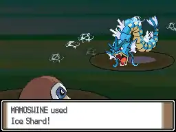 Mamoswine creates a glowing, light blue ball of ice in-between the ends of its tusks and fires it at the opponent. When it hits the opponent, the opponent becomes frozen; or, Mamoswine releases multiple glowing, light blue icicles from its mouth at the opponent. | ||