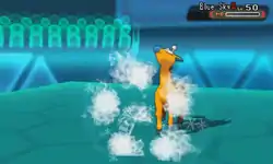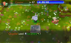 A glowing, light blue block of ice forms in front of Swinub's nose, and it then fires it at the opponent, or Swinub fires a beam of white wind with shards of ice in it at the opponent. | ||