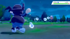 Froslass floats into the air and spins her body rapidly, releasing multiple glowing, light blue balls of ice from her body at the opponent, or Froslass raises her arms above her head and forms a light blue, glowing ball of ice in between them. She then tosses the ball at the opponent. | ||