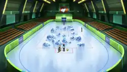 Like in the games, the Gym is located underground, and is kept constantly cold. The battlefield is covered with ice, similar to a hockey rink, with large chunks of ice standing on it. The slippery conditions can offer a challenge of their own for unprepared challengers.
