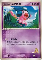 Ilene's Mime Jr. (Japanese: アイリーンのマネネ Eileen's Manene) is a Psychic-type Basic Pokémon card. It is part of the Movie Commemoration VS Pack: Aura's Lucario.