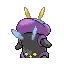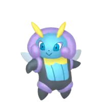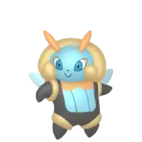 Illumise is a firefly-like, bipedal Pokémon. It has a blue face and large, slanted blue eyes with purple markings at the corners. Surrounding its head are purple curls that frame its face. Its antennae are small and yellow. Its body is black with a blue belly and a yellow bid marking. Its arms and legs are black and are connected to the body by purple borders. It has small wings used for flying with others, and a pattern of three oblong yellow spots on its rear. This is a female only species; Volbeat is its male counterpart.
