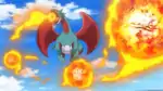 Salamence shoots fireballs with a bright center and black highlights at the opponent. Salamence can either charge this attack briefly, laying out a few fireballs in front of it which it launches together, or it can fire them separately in sequence. | ||