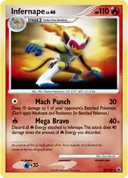 Infernape (Japanese: ゴウカザル Goukazaru) is a Fire-type Stage 2 Pokémon card. It is part of the Majestic Dawn expansion.