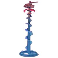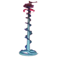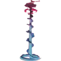 As Gigantamax Inteleon, it has become larger with a noticeable change. Its tail has extended to 130 feet while stretching out to resemble a pillar. It also has dark purple frills circling around the tail. The rest of the tail coils around to resemble a platform for Inteleon to take a battle position on. It also gains a small blue harpoon that attaches to one of its index fingers. The white sclerae in its eyes change to dark red. Three red clouds circle around the tail a short distance below the coiled tail platform.