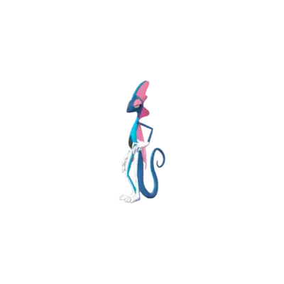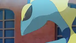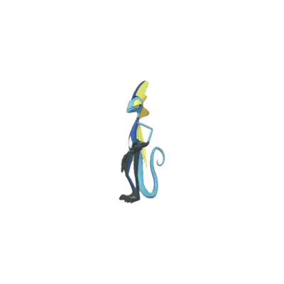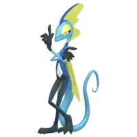 Inteleon is a bipedal, reptilian Pokémon that resembles a chameleon. Its head, slender arms, and tail are light blue in coloration, with the tail having a thin dark blue streak following the ridge of the tail. The tail contains a sharp knife hidden within. This dark blue coloration is also seen at the tip of his head crest and on its slender torso, which continues down the backside of its legs until the bottom of the feet. The front side of its legs and feet are black, ending in three-pointed toes. Its hands are also black and have five fingers. Its eyes have yellow irises and white pupils with a black lower lid and a yellow upper lid, and the yellow portion creates a semi-circular pattern on its face. It has black nictitating membranes that extend over its eyes when using Snipe Shot. This yellow skin is also seen on its crest, which is connected from the top of its head to the back of its neck before falling over its back in a cape-like fashion. This crest is thin and wavy, similar to a fin. It has a white diamond-shaped patch of skin on its stomach.
