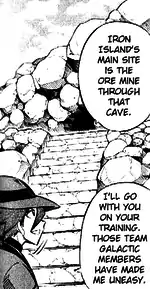 In Hurrah for Rapidash, Byron intructed Diamond to go train on Iron Island. The island itself appeared from Lucky Lucario I to Vexing Vespiquen & Unmanageable Mothim II, where Diamond undertook training there, instructed by Riley. After losing a training battle against Riley, Diamond was instructed to traverse through the island five times and train his battle skills against the wild Pokémon living in the island's caves. Riley accompanied Diamond the first time through, leaving the Pokédex holder to handle the remaining times on his own and healing his Pokémon after each round.