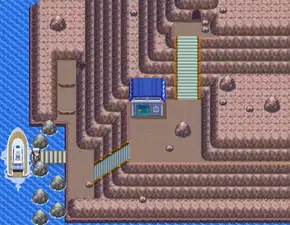 The main point of access to Iron Island is at its southwest corner, which has a dock for access by boat from Canalave City. One of the openings to the inside of the island is blocked by ledges, and thus its role is more like that of an exit. In front of the dock is two sets of stairs, separated by a landing on which a cabin apparently owned by Canalave Gym Leader Byron is located. The stairs lead to another cave opening, the only other way to enter the island.